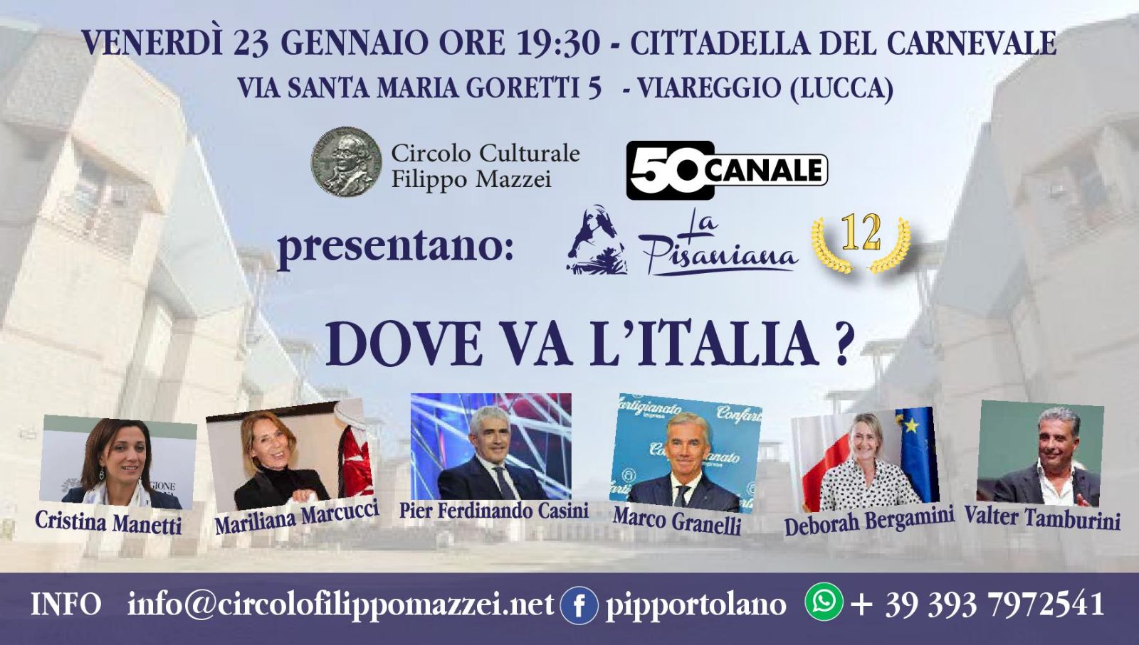 Venerdì 23 Gennaio riparte la dodicesima stagione della Pisaniana del Circolo Culturale Filippo Mazzei , economia , politica , territori , cultura , l'italia del 2026 al centro del dibattito del primo talk dell'anno dalla Cittadella del Carnevale di Viareggio a pochi giorni del varo della kermesse tra anteprime e scoop dell'edizione annuale Ospiti del Tal condotto da Carlotta Romualdi l'Assessore Regionale alla Cultura ed alla Ricerca della Felicità Cristina Manetti l'Onorevole versiliese Deborah Bergamini Marialina Marcucci Presidente della Fondazione Carnevale di Viareggio Valter Tamburini Presidente della Camera Commercio Toscana Nord-Ovest Marco Granelli Presidente Nazionale di Confartigianato Imprese per l'talia ed il Senatore Pier Ferdinando Casini che torna alla Pisaniana con il suo ultimo libro edito dal Mulino Al centro dell'Aula .