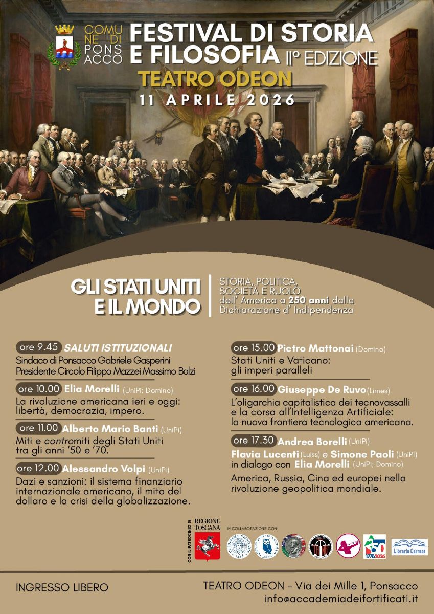 Il Festival della storia e della filosofia torna a Ponsacco con la seconda edizione dedicata agli Stati Uniti e al loro ruolo nel mondo contemporaneo, in occasione dei 250 anni dalla Dichiarazione d’Indipendenza.